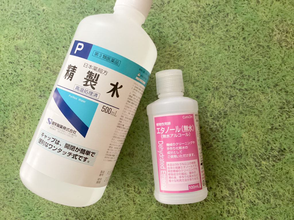 少量の無水エタノールにエッセンシャルオイルを混ぜてから精製水と合わせます。